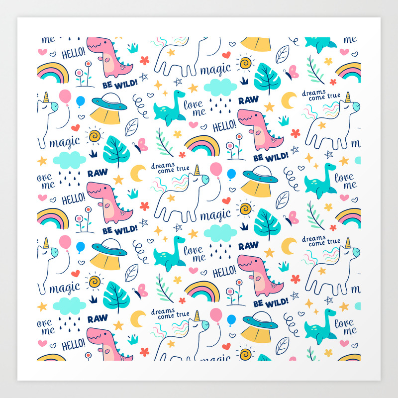 Cute Be Wild Magical Doodle Illustration Unicorns Rainbows And Dinosaurs Pattern Art Print By Machmigo Society6
