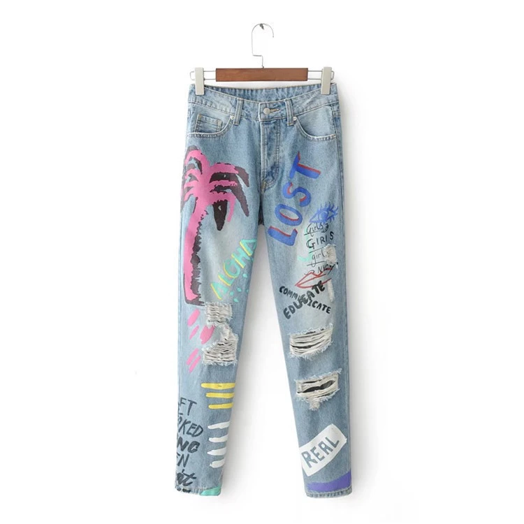 Autumn Doodle Print Jeans Women Ripped Hole Denim Pants Capris Jeans Casual Party Pencil Pants Streetwear Ripped Holes Jeans Womanwomens Ripped Aliexpress
