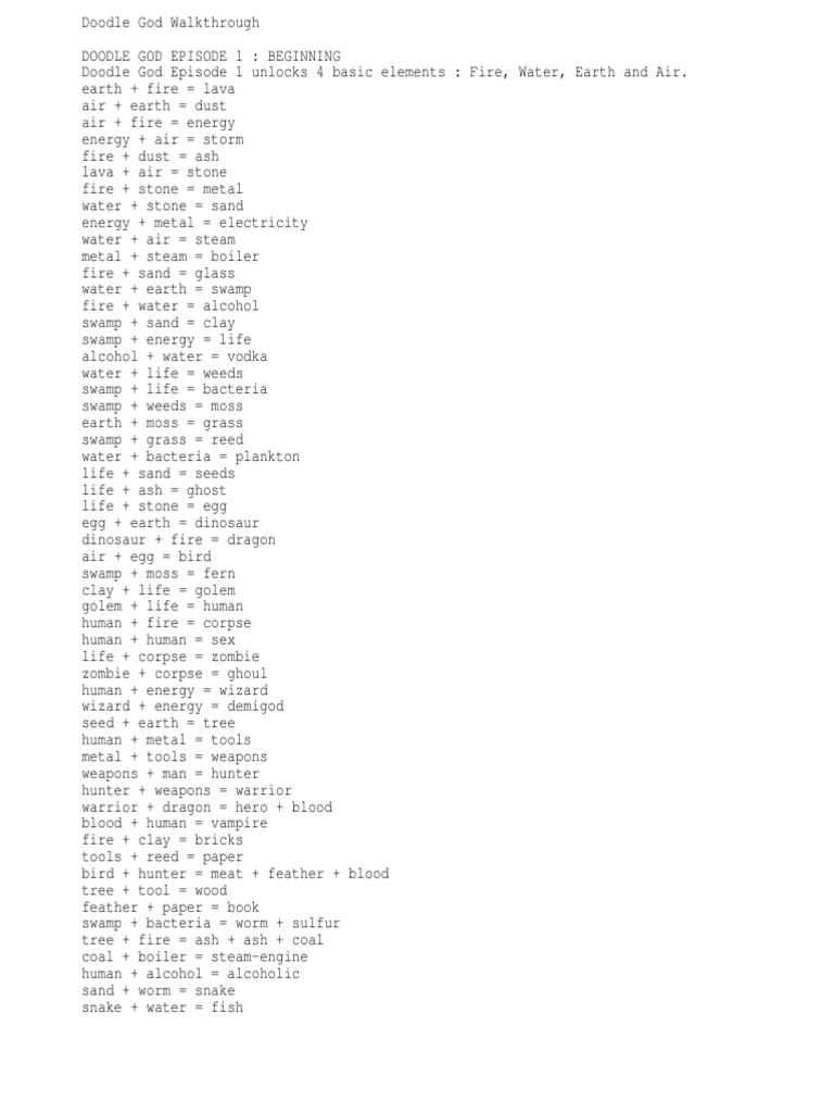 Doodle god is a puzzle game in which you ll need to combine elements to discover new ones to which you ll then combine to discover more new elements and so on. Stone stone fire stone stone 3 times fire stone metal 2 times human metal tools tools tree tools wood 3 times tools wood wheel wheel wood cart air water steam metal steam boiler fire wood ash coal boiler coal steam engine cart steam engine locomotive.