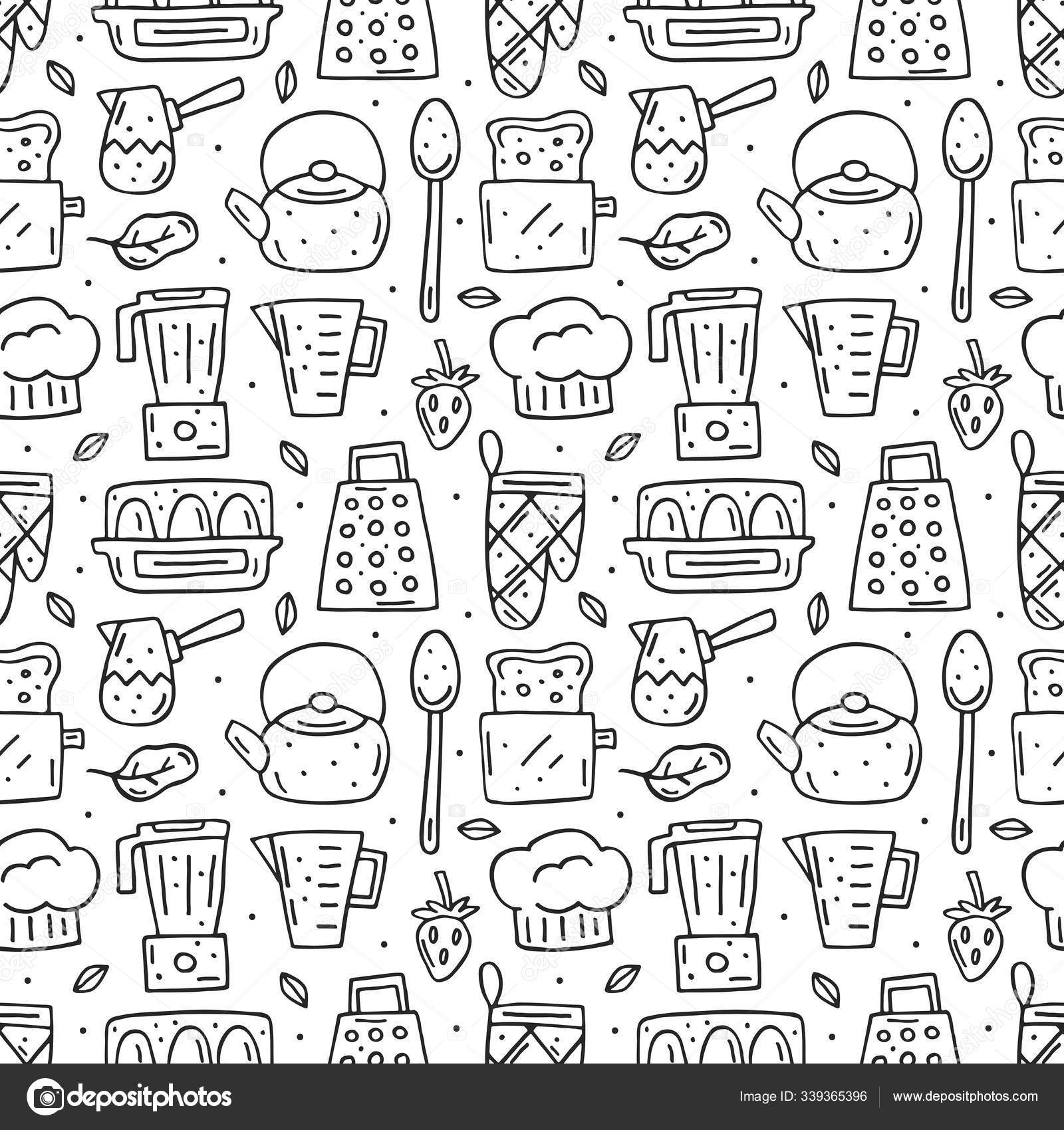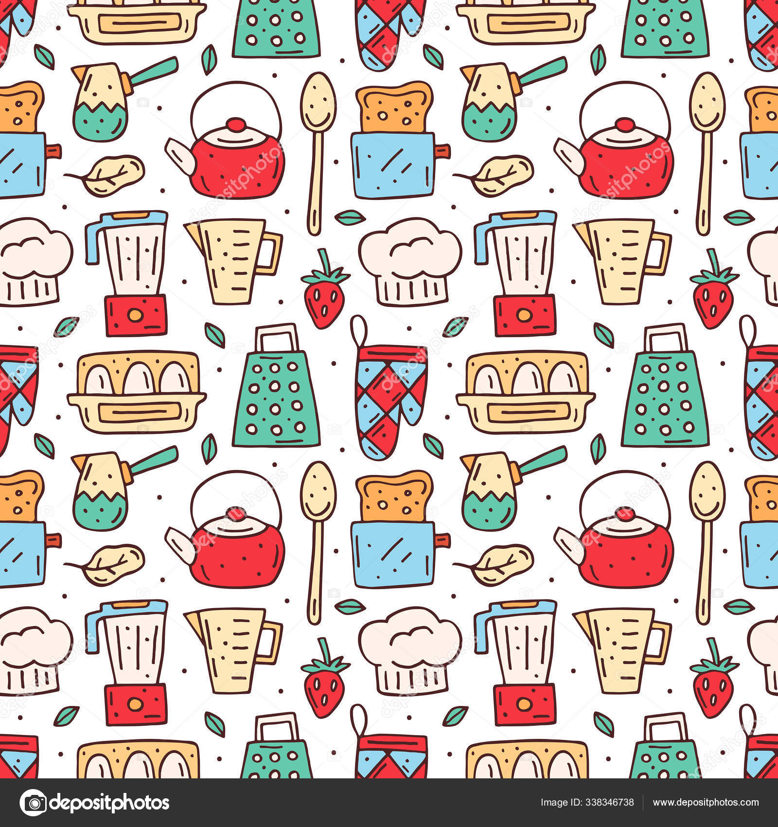Kitchen Elements Cute Doodle Hand Drawn Cartoon Vector Seamless Pattern Stock Vector C Fox Biz 338346738