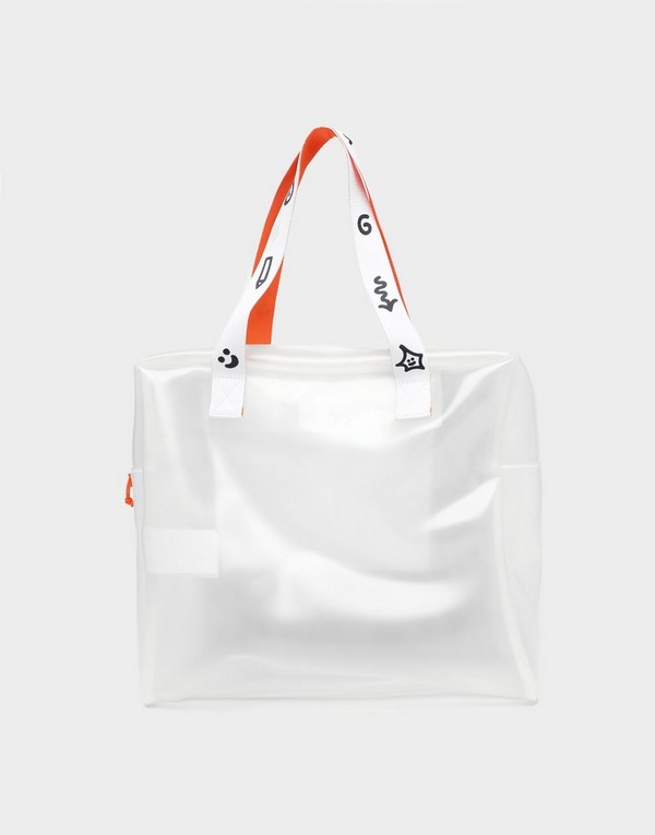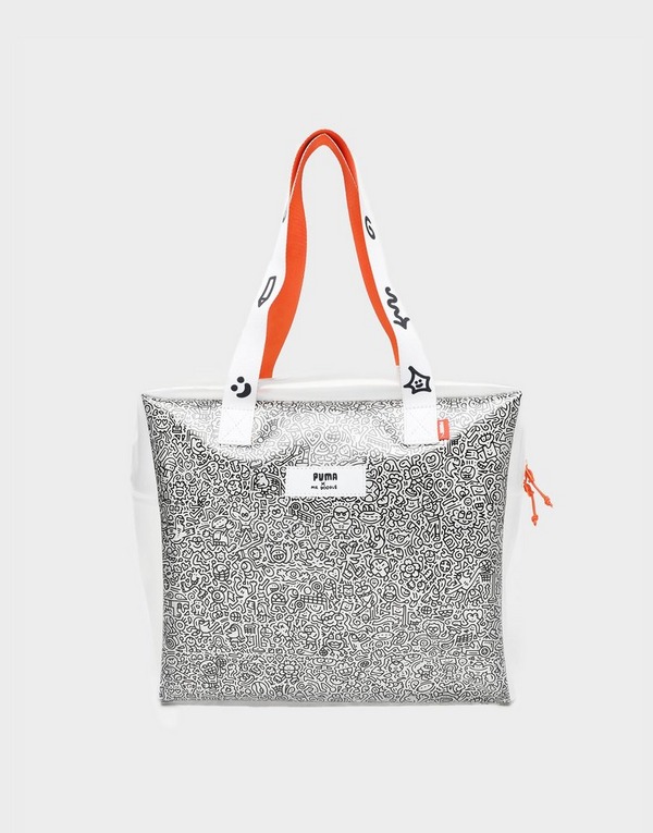 Doodle shopper bag is clad with sports inspired doodles. Featuring a large main compartment with a zip and an internal zip pocket for smaller items this bag pops with its semi transparent material and wild design. This season the worlds of puma and mr.