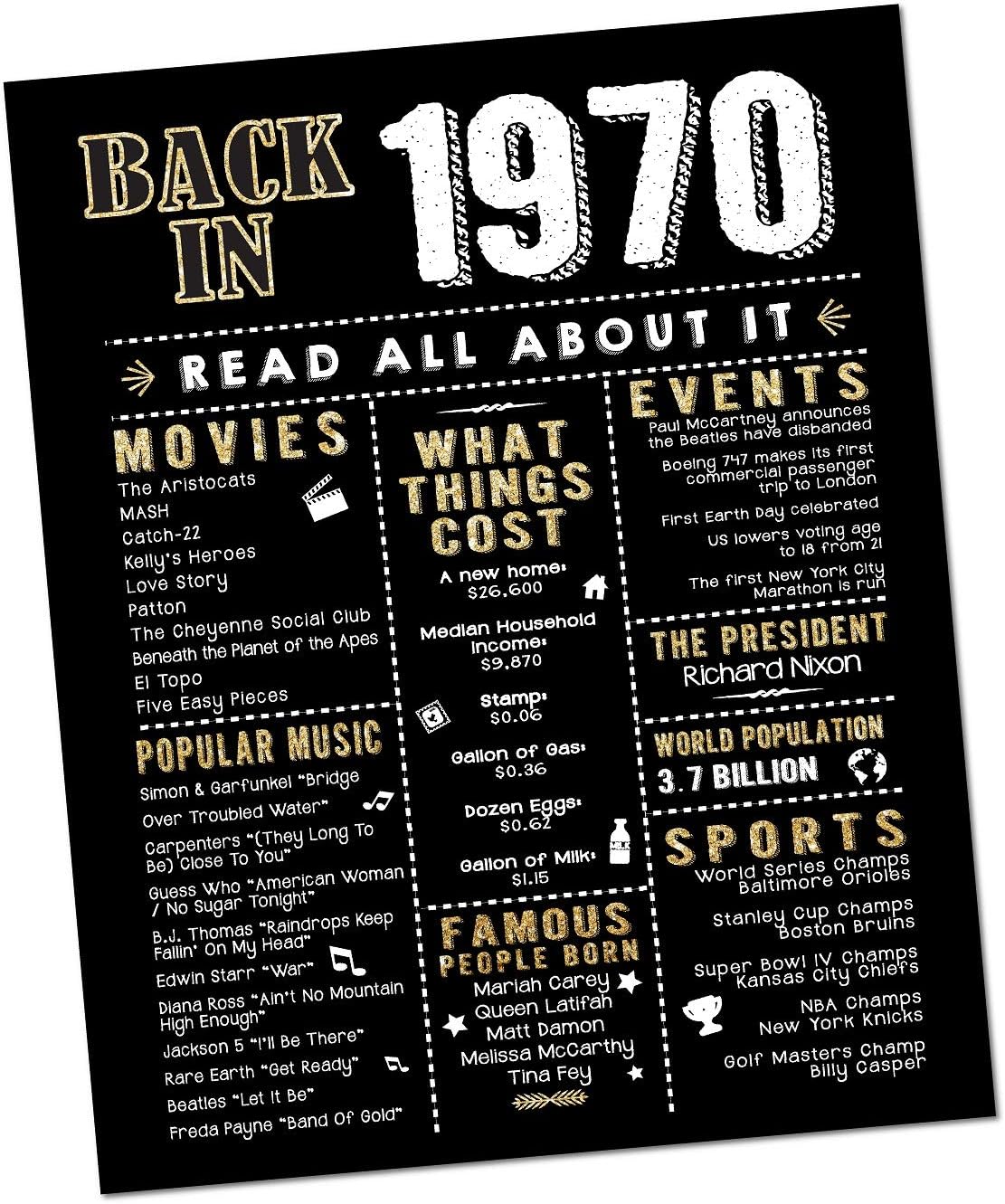 Amazon Com Katie Doodle 50th Birthday Party Decorations Supplies Anniversary Card Gifts For Men Or Women Turning 50 Years Old Includes 8x10 Back In 1970 Print Unframed Black And Gold Posters Prints