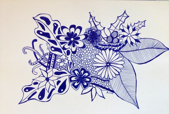 Original Blue Ink Pen Flower Doodle Drawing 3 Etsy