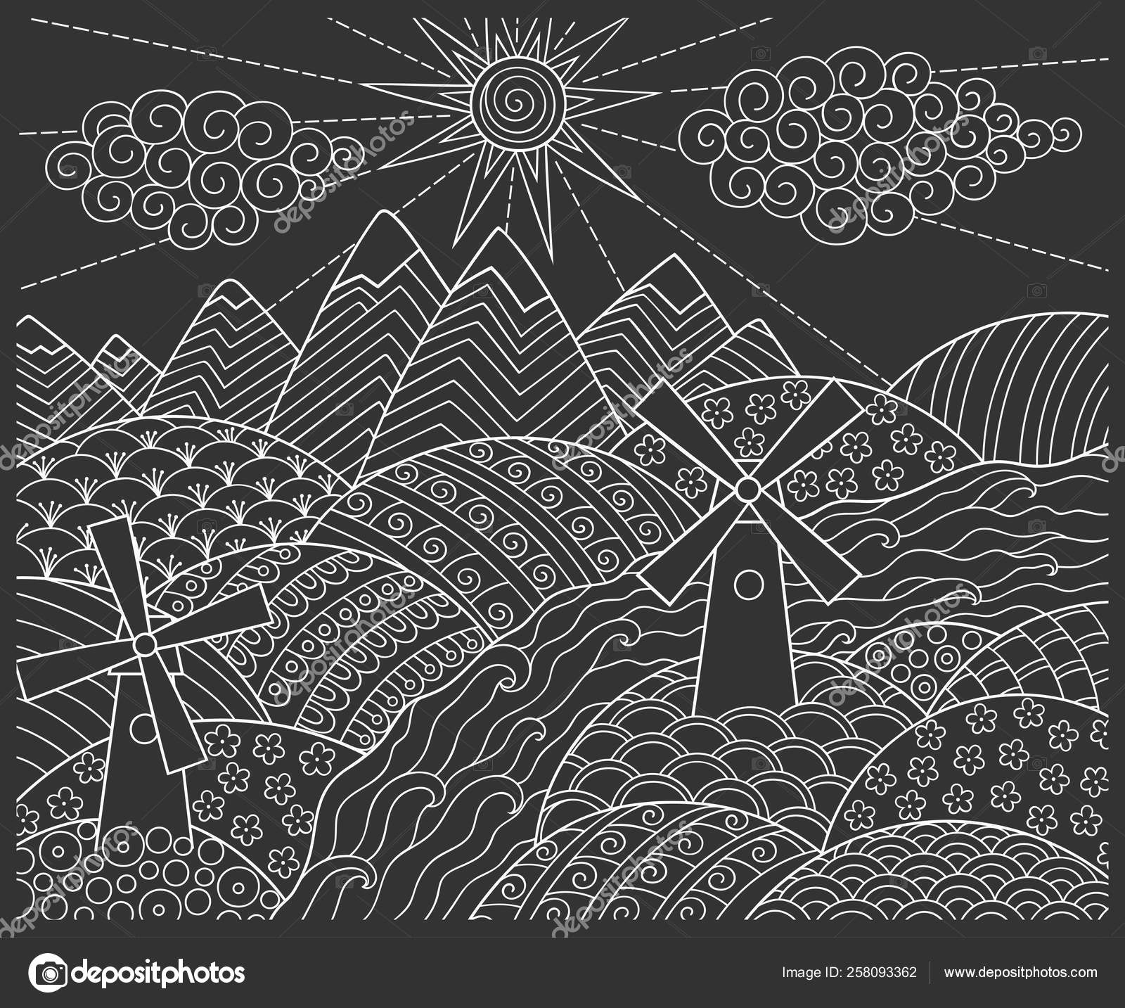 Landscape Mountains Rivers Fields Hills Windmills Sun Cloud Outline Doodle Stock Vector C Rugame Tera Gmail Com 258093362