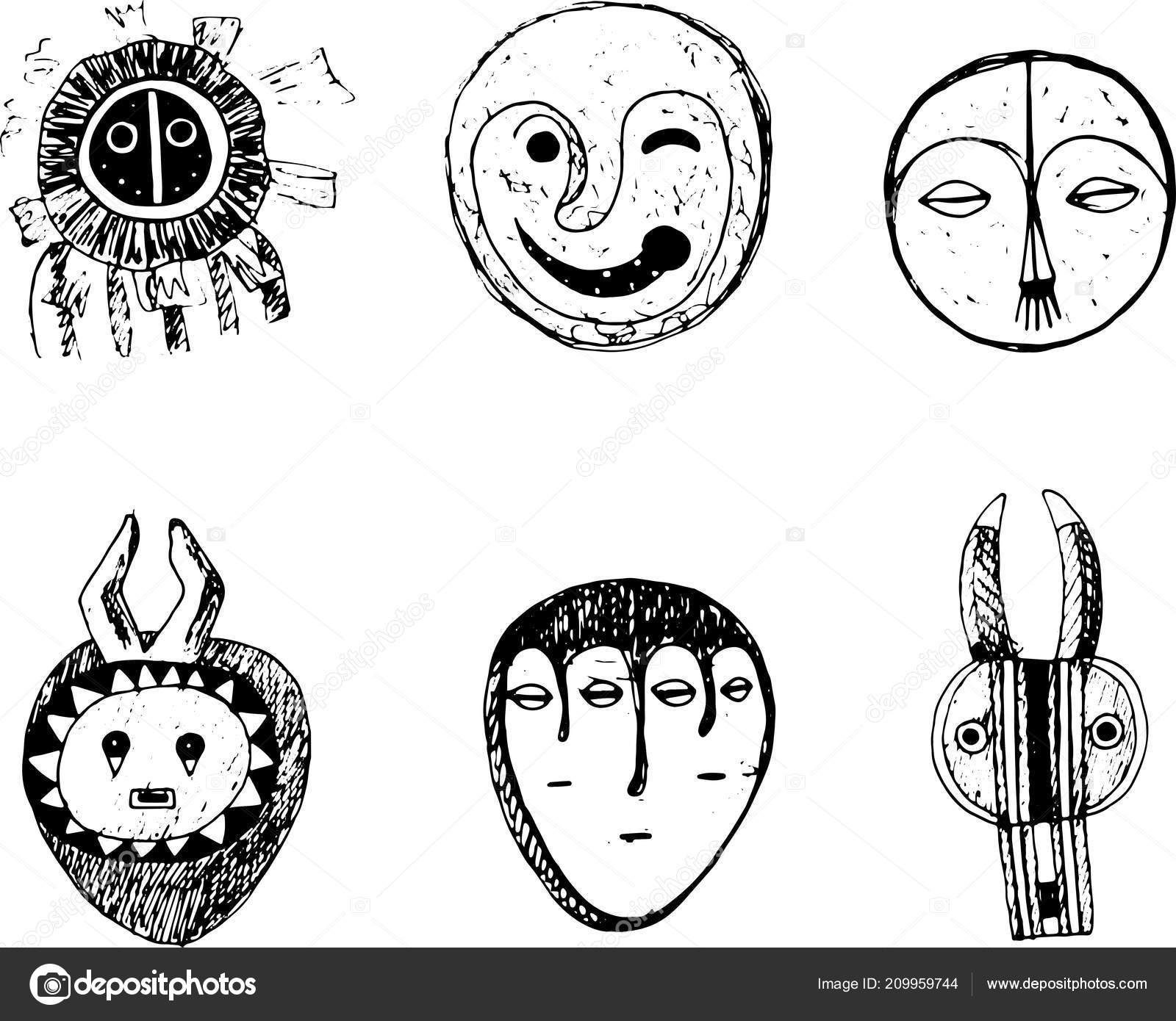 African Mask Sketches African Mask Set Sketch Doodle Graphic Art Isolated Elements Collection Stock Vector C Fesleen 209959744