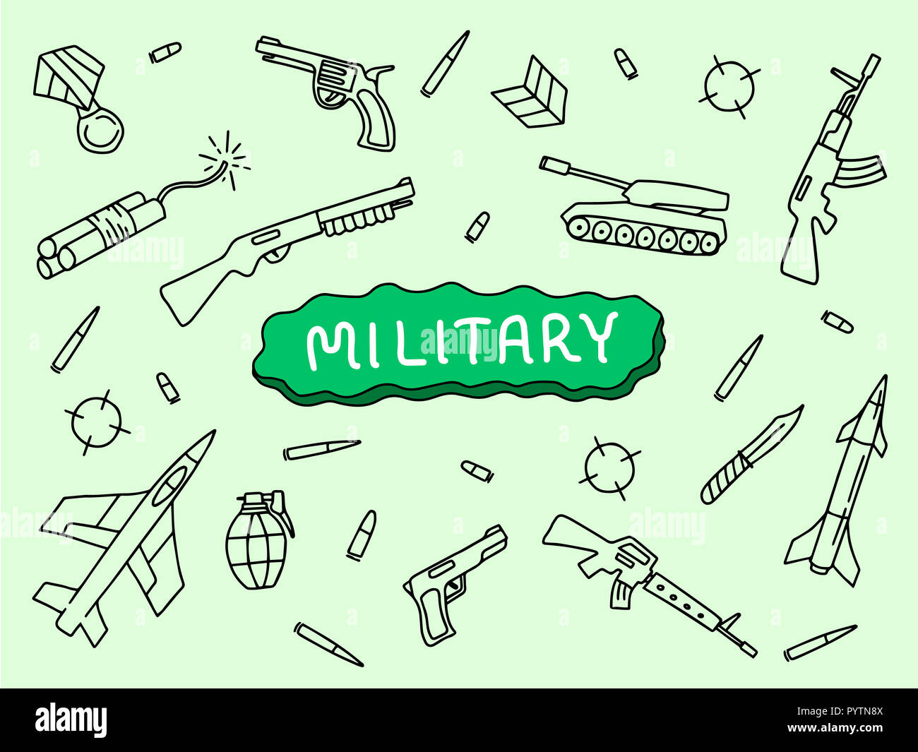Military Doodle Art Hand Sketch Vector With Tank Riffle Aircraft With Banner Text With Green Background Vector Illustration Stock Photo Alamy